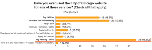 This was an extremely important piece of finding in the overall scope. We used this list to frame our in-person interviews, because ultimately we wanted to find out what citizens of Chicago use the city website for. To find out, we sent out a survey for all who have dealt with the CoC website.